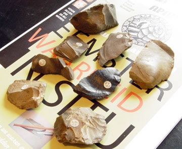 Ter herinnering: ‘Eemster waarheid in situ’. Het waren deze acht artefacten die de basis vormden voor de vondstmelding van Eemster in 2003. Al deze stukken komen rechtstreeks van de site. De kleine discoïde op de voorgrond werd er in een vliegende sneeuwstorm door ondergetekende, in de winter van 1992, opgegraven op een diepte van zo’n 60 cm, uit de bovenlaag van het keizand. De lichtgekleurde matrix is nog aanwezig in kieren en holtes. En omdat deze artefacten gevonden zijn na het overlijden van Vermaning konden ze een rol gaan spelen. Het gaat om: een klein opgegraven discoïde vuistbijltje; een korte steelschrabber op afslag; een stekerachtig werktuig op afslag; een convexe schaaf op afslag; een steelschrabber op afslag; een afslagwerktuig; een kort vierkant schrabbertje op afslag; een klein rugmes op afslag (zijn dubbelganger werd gevonden in de buurt van Eelde).