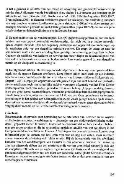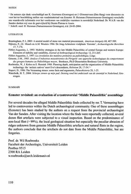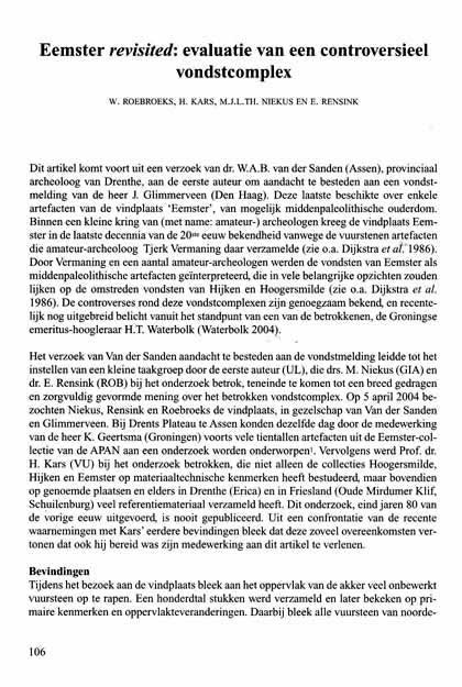 Hiernaast de kopie van het rapport Roebroeks dat in 2004 gepubliceerd werd in de Nieuwe Drentse Volksalmanak. Het werd zorgvuldig buiten de nationale vakwereld van de instituten gehouden. Het taalgebruik in het rapport Roebroeks is eenmalig, we zijn het tot nu toe in geen enkel ander Nederlands artikel over archeologie tegen gekomen. De conclusies in het rapport zijn tot stand gekomen door het op de hand en door een loep bekijken van een deel van de artefacten van Eemster. Op de vindplaats is geen schep in de grond gestoken. Er is geen 'geijkt' archeologisch onderzoek uitgevoerd. De conclusies bestaan alleen maar uit beweringen. Eemster was de laatste bij de wetenschap bekende in situ van een Neandertalvindplaats in Nederland.