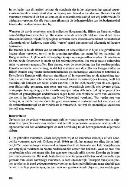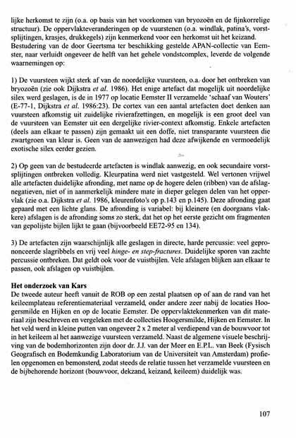 Hadden de heren dan na zoveel jaren helemaal niets nieuws te melden? Jazeker: het gebruikte vuursteen deugde niet. De artefacten van Eemster zouden uit verkeerde vuursteen zijn gemaakt, namelijk uit silex van zuidelijke herkomst. Niks bryozoënvuursteen, zoals dat volgens hen zou horen. De toegepaste vuursteen komt op het Drentse keileemplateau niet voor volgens de vier wetenschappers en ze beroepen zich daarbij op een erkende specialist op dit gebied: Harry Huisman van het Natuurmuseum Groningen. Stom toch van zo’n Vermaning, om dáár niet aan te denken! Of van Wouters, althans volgens de hersenspinsels van prof. Waterbolk (2003), waarnaar de heren zelfs in hun inleiding durven te verwijzen. Jammer voor het viertal, dat Huisman zich door hen erin geluisd voelde, omdat ze geen enkele context bij hun vage vraagstelling hadden gegeven. In het Dagblad van het Noorden van 15-1-2005 neemt de stenenkenner nadrukkelijk afstand van de kwalificatie: “exotische” vuursteen. De hem door de APAN getoonde blauwgrijze stenen van Eemster zijn helemaal niet van zuidelijke herkomst. Weliswaar is het materiaal wat matter dan de meeste noordelijke gesteentesoorten, maar het komt naar zijn zeggen - en volgens de praktijkervaring van verscheidene APAN-leden - op diverse andere plaatsen in het noorden voor. De Neandertalers hoefden dan ook niet vanuit het huidige Limburg met een zware vracht aan keien te zeulen. Overigens: de literatuurgegevens over de korte afstand die volgens het artikel in de Nieuwe Drentse Volksalmanak met manuport steenmateriaal werden overbrugd kunnen met hetzelfde gemak worden vervangen door bronnen die spreken over 60 km en meer. Nota bene: Roebroeks maakt zelf melding van grootschalig transport van Rijckholt vuursteen in het Paleolithicum naar de Duitse vindplaats Gönnersdorf, hemelsbreed liefst 120 kilometer (Roebroeks, 1980). Dit zou volgens Löhr (1976) gebeurd zijn in de vorm van “Rohstücke”.