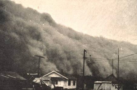 Op de website www.geo.uu.nl staat het volgende over de Amerikaanse stofstormen uit de dertiger jaren: In de dertiger jaren van de vorige eeuw werden grote delen van de Verenigde Staten langdurig en vaak geteisterd door hevige stofstormen (dust bowls). Dat had te maken met een periode van langdurige droogte en hoge temperaturen. De stofstormen waren vaak zo hevig dat hele dorpen aan het oog werden onttrokken. De schade was vaak enorm; zo zouden de houten telefoonpalen die nog steeds overal op hetAmerikaanse platteland langs de wegen staan, zo sterk door het zand worden geabradeerd, dat ze zouden omvallen. Daarom werden ze tegen de abrasie beschermd door een metalen omhulling aan hun onderzijde aan te brengen.