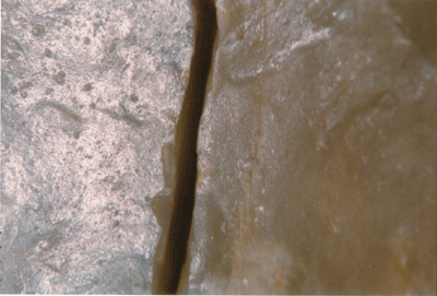 Met hyaliet opgevulde vorstscheur in een stuk vuursteen. Op deze foto is duidelijk te zien dat het hyaliet zich over de scheur in de vuursteen heeft afgezet. Dit betekent dat de scheur al in de steen aanwezig was voordat het hyalietafzettingsproces een aanvang nam. Het hyalietoppervlak is hoogglanzend. Mogelijk dat er daardoor zolang vastgehouden wordt aan debenaming windlak. Blijkbaar tegen beter weten in, want in diverse publicaties van verschillende wetenschappers komen we beschrijvingen tegen van krassen die onder de windlak liggen. Dan kan windlak niets anders wezen dan het doorzichtige laagje hyaliet, het tegenovergestelde van abrasie. Foto: G.J. van Noort.