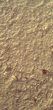 Hyaliet op vuursteen. (Vergroting x250). De hyaliet-glas-afzetting is een patina die als het ware over het oppervlak lijkt te zijn heen gevloeid. Dit is te zien op het grensvlak tussen het ruwe verse vuursteenoppervlak op het onderste deel van de foto en het gladde bovendeel met hyaliet. Het onderste deel is een vers breukvlak. De vuursteen is op dat vlak pokdalig en bestaat uit heuvels en dalen. Het hyaliet, dat in feite ontstaan is uit een gel, was tijdens het afzetten vloeibaar. Het heeft de dalen op het bovenste (ooit verse) vlak opgevuld en reikt zelfs over de toppen heen. Na indrogen ontstond er een vlak glad oppervlak met een hoogglans. Hyaliet is dus een afzetting en de dikte ervan is te meten met een microscoop. Dit is precies tegenovergesteld aan 'abrasie'. In dat proces wordt het oppervlak gebombardeerd metkleine steentjes ter grootte van zandkorrels en daardoor verdwijnt er materiaal, er ontstaat geen hoogglans (zie het effect daarvan hier direct onder). Foto: G.J. van Noort.